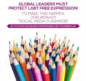 Cette année marquera la 10e célébration de la Journée internationale contre l’homophobie et [depuis 2009] la transphobie. Le thème pour le 17 mai cette année sera la « liberté d’expression » qui permet de célébrer les diversités sexuelles et du genre dans le monde entier. IDAHOT commémore le jour, il y a 24 ans, le 17 mai 1990, lorsque l’Organisation mondiale de la santé a retiré l’homosexualité de la liste des maladies mentales. Pour plus d’informations sur la plupart des centaines de manifestations prévues dans le monde entier, visitez le site officiel du IDAHOT.