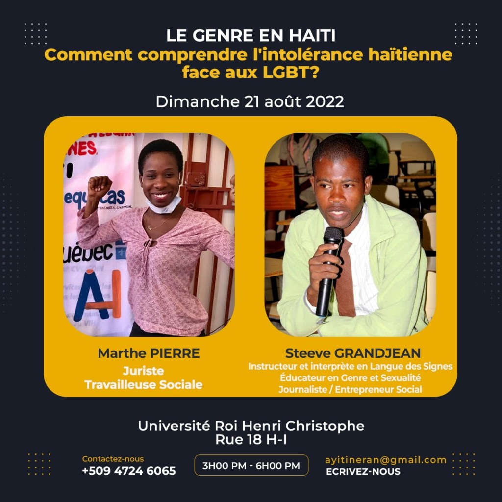 Steeve Grand-Jean : « Je suis Steeve Grand-Jean, j’ai 33 ans et je viens de l’univers du journalisme et de l’animation radio. Je suis issu de la ville du Cap-Haïtien, la deuxième grande ville du pays et je fais partie des communautés LGBTI. Ce qui m’a d’abord interpelé, c’est le manque d’espace de délibération et la vision souvent manichéenne qui accompagne le débat public autour de sujets sociétaux. C’est pour éduquer mon peuple face à des idées fausses que j’ai fondé AIES« .