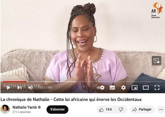 76crimes : « Après une brève introduction, Nathalie commence sa vidéo ainsi : « pour moi l’Etat n’a pas à s’immiscer dans les choix sexuels ou maritaux d’adultes responsables et consentants. Vous voulez vous mougou (faire l’amour en nouchi) entre hommes, entre femmes, ou vous voulez prendre 18 femmes, c’est votre choix ». N’y voyez-vous pas un appel encourageant à la dépénalisation de l’homosexualité en Afrique ? »