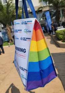 Jérémie Safari : « Du 14 au 16 juin, les professionnels du secteur minier du pays se réunissent à l’hôtel Karavia de Lubumbashi dans le Katanga, pour la « DRC Mining Week », à cette occasion ont été remis un kit aux visiteurs et participants, avec entre autres, un sac aux couleurs bien identifiables, ainsi qu’une brochure en lien avec l’évènement.