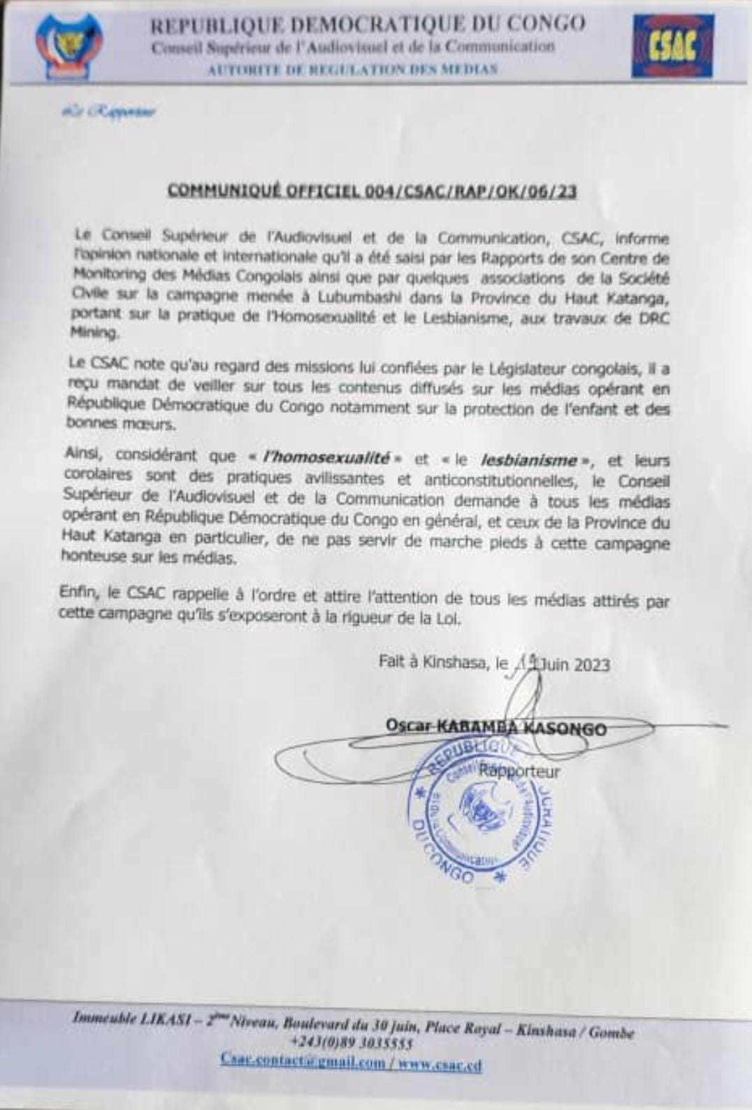 Aujourd’hui, il apparaît que le champ de la répression s’étend de nouveau, puisque les médias qui ne servent pas de caisses de résonance aux campagnes LGBTphobes, sont maintenant dans la ligne de mire du Conseil Supérieur de l’Audiovisuel Congolais (CSAC) dans un communiqué à l’adresse de « l’opinion nationale et internationale », en date du 19 juin dernier.