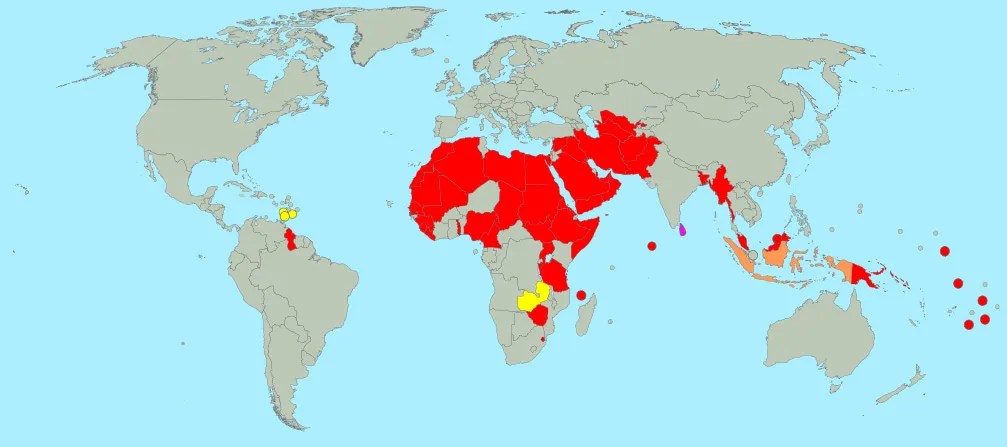 – L’Indonésie, en orange, a des lois qui ne criminalisent l’homosexualité que dans certaines juridictions infranationales. N.D.R.L. : En raison de sa nouvelle loi anti-LGBT, le Kenya devrait figurer prochainement en rouge sur une cette carte en cours de préparation.