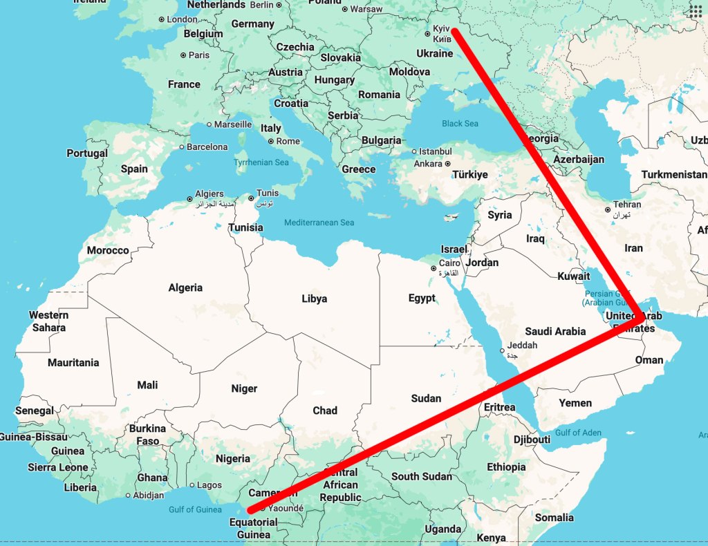 Les voyages de Gaël de Douala au Cameroun, à Dubaï aux Émirats arabes unis, puis à Kharkov en Ukraine.