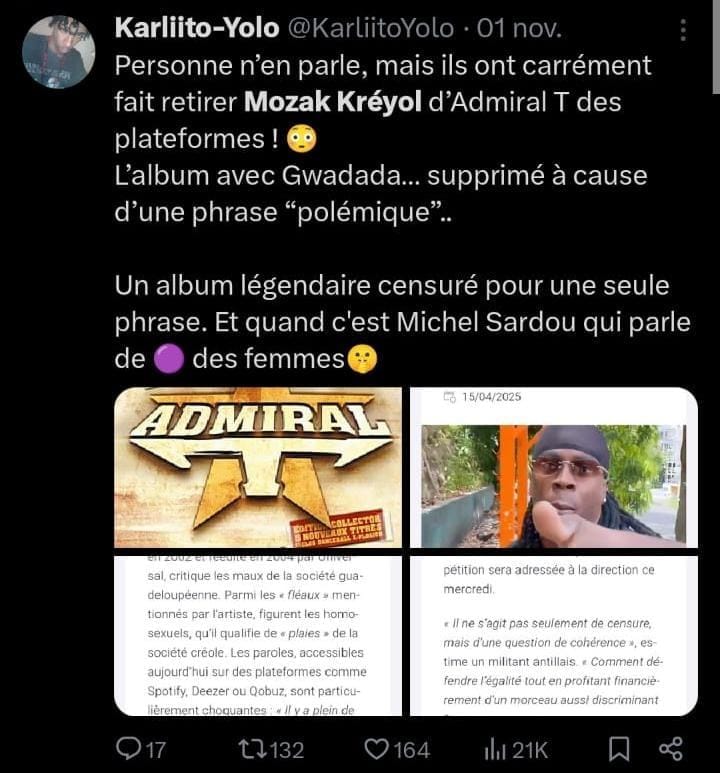En Guadeloupe, bien que les LGBTphobies continuent à s’exprimer à travers le cinéma, avec le concours du groupe Canal Plus ou qu’elles soient patrimonialisées par le service public; 2024, puis 2025 ont été deux années charnières où les plateformes, Spotify puis Deezer ont retiré l’une après l’autre l’album Mozaïk Kréyòl (2004) de leur catalogue.