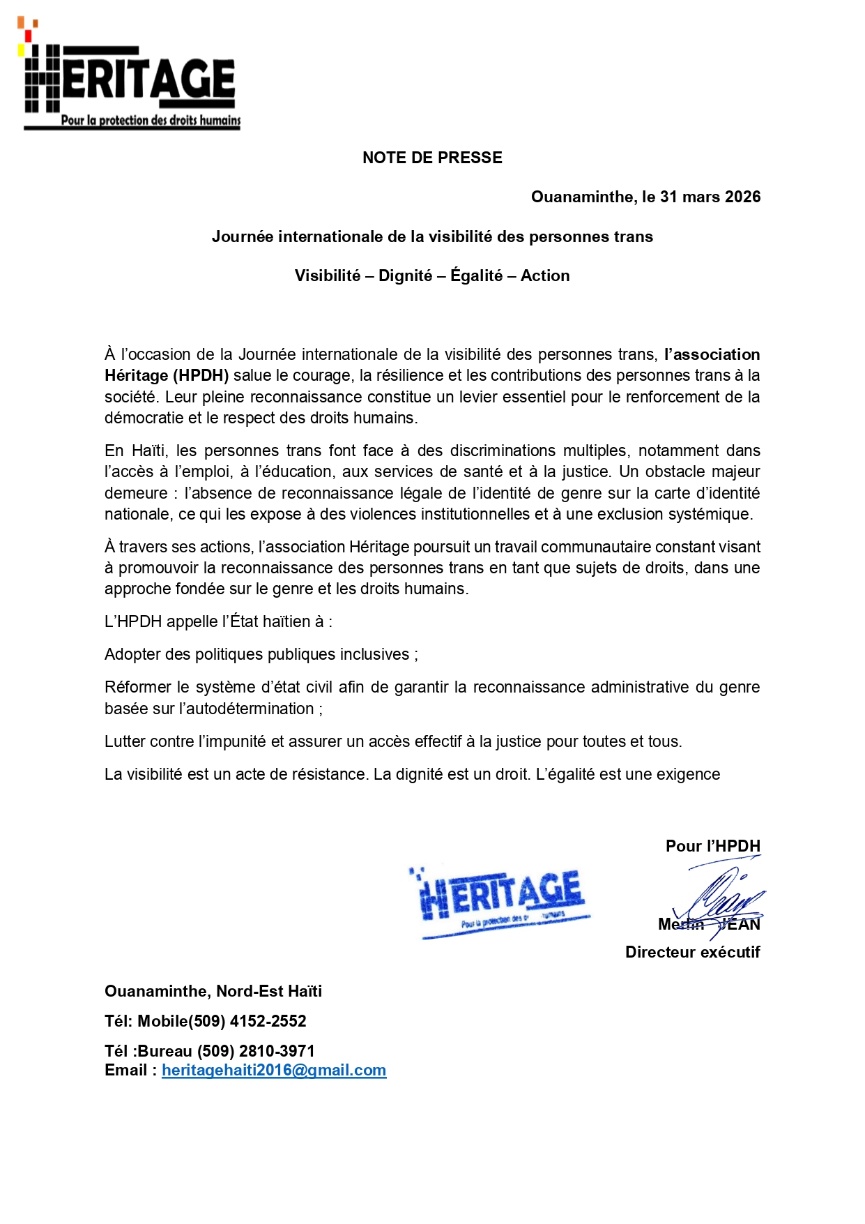 A l’occasion de la journée internationale de la visibilité trans, le 31 Mars, l’association Héritage Pour la Protection des Droits Humains (HPDH) dans le nord d’Haïti tient à rappeler qu’en dépit du contexte politique et sécuritaire extrême qui règne dans le pays – avec un nouveau carnage ayant causé 70 morts le 30 mars en Artibonite – les organisations de la société civile continuent à se mobiliser pour réclamer davantage de reconnaissance juridique en faveur des personnes trans, notamment pour le changement de genre à l’état-civil, mais aussi pour davantage de droits économiques, en termes d’insertion professionnelle.